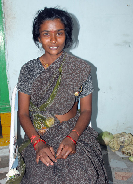 M Lakshmi is a about 35 years old. Lakshmi and her mother Kumari and her sister Vardhini came to old age home 6 years back. Lakshmi was married and after sometime had two children a son and a daughter. Her husband is an alcoholic and would beat her quite often. This caused her to lose her mental stability and she became deranged. She was unable to care for her two children and had to let her mother-in-law raise her son, and her daughter was adopted. Then she was brought to the ashram by her mother with her sister. She moves around laughing and talking incoherently. In the ashram everybody calls her Chanchu Lakshmi (aborigine Lakshmi). |